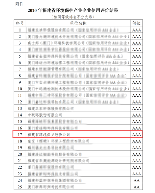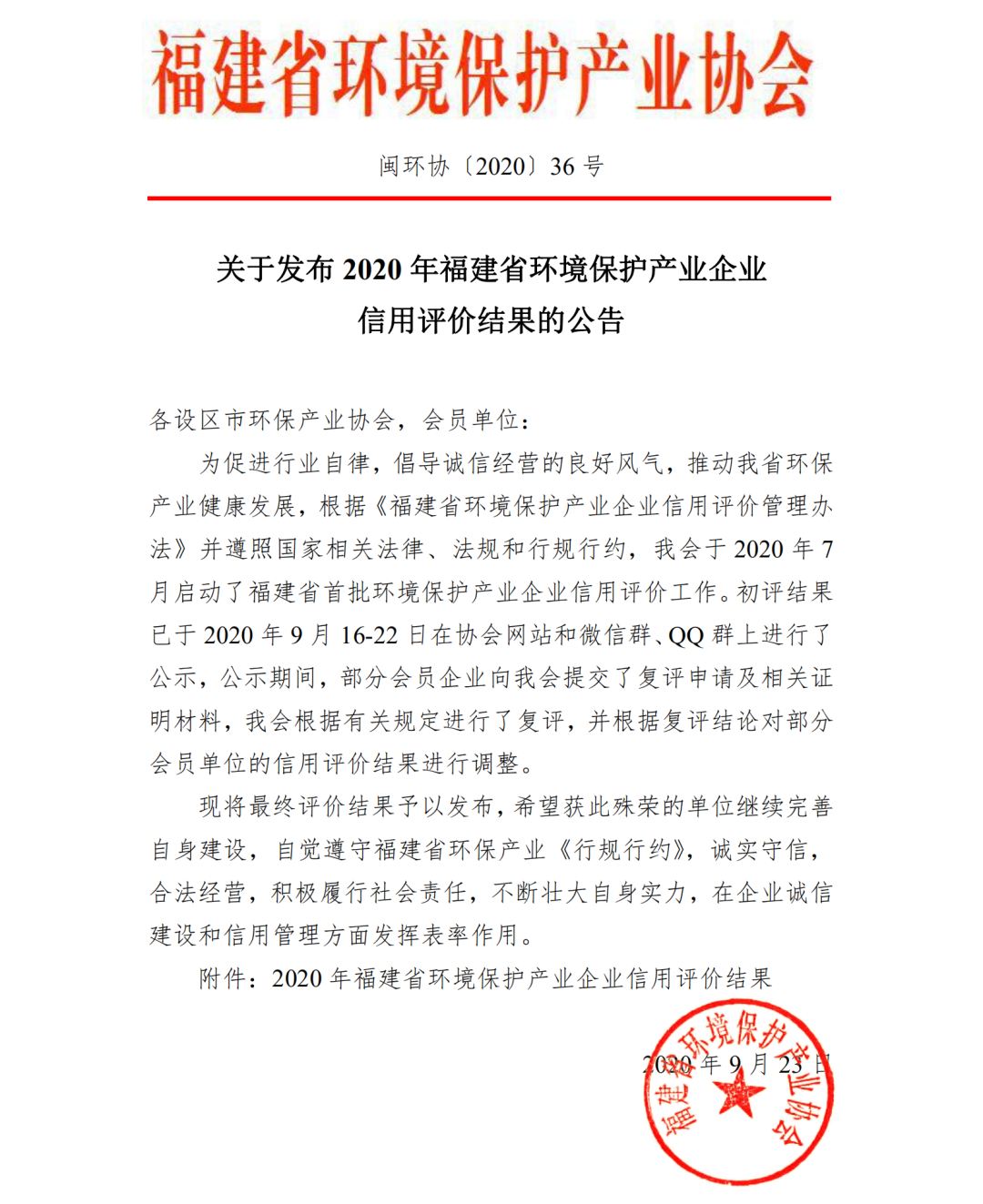 9月23日,2020年福建省環(huán)境保護(hù)產(chǎn)業(yè)企業(yè)信用評(píng)價(jià)結(jié)果公布,福建省環(huán)境保護(hù)股份公司在企業(yè)整體水平、財(cái)務(wù)狀況、管理水平、技術(shù)能力和信用情況等考量指標(biāo)體系中均表現(xiàn)優(yōu)異,被授予福建省環(huán)保產(chǎn)業(yè)企業(yè)信用評(píng)價(jià)等級(jí)最高級(jí)別AAA級(jí)。